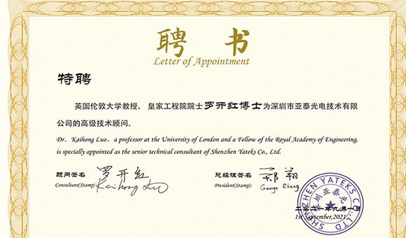 风劲帆满海天阔,牵手阔步新征程!2021年9月1日,深圳市亚泰光电技术有限公司特聘英国伦敦大学教授、皇家工程院院士罗开红博士为高级技术顾问。亚泰光电总经理郑翔为罗开红博士颁发了聘书。