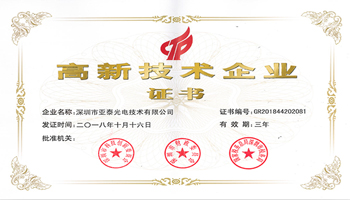 近日,我司收到深圳市科创委、深圳市财政委员会、国家税务总局深圳市税务局联合颁发的高新技术企业证书,标志着我司顺利通过2018年 “高新技术企业”复审认定。这也是对深圳市亚泰光电技术有限公司多年来坚持自主研发、技术创新、坚持走高新技术发展道路的有力肯定。