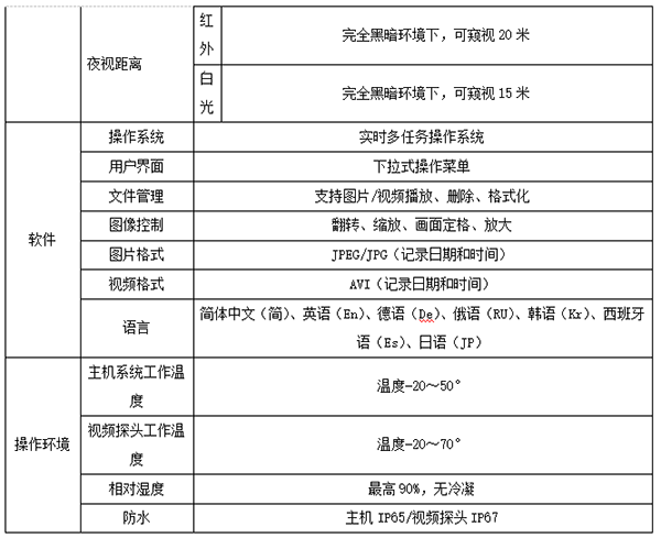 2)可见光摄像头用于观察内部裂纹、锈蚀、异物等。广泛应用于航空、汽车、船舶、电气、化学、电力等现代核心工业生产、检修等多个环节。采用高亮光纤照明技术,发射5000K可见光源,照度可达60000Lux以上;