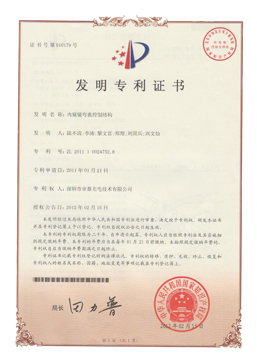 亚泰光电首页  >>  走进亚泰  >>  亚泰光电资质荣誉  >>   发明专利  >>  内窥镜弯曲控制结构