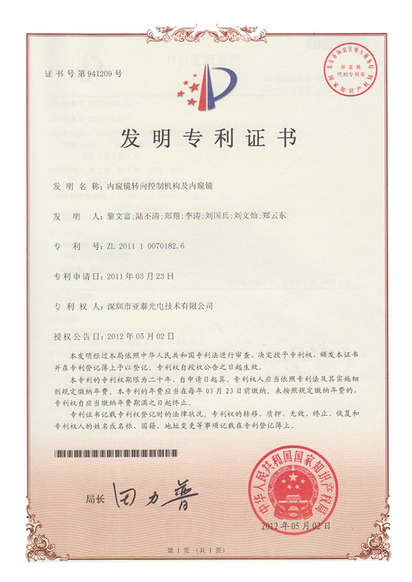 亚泰光电首页 >> 走进亚泰 >> 亚泰光电资质荣誉 >> 发明专利 >> 内窥镜转向控制机构及内窥镜