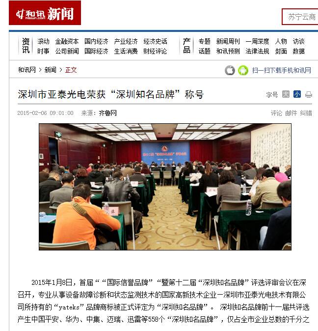 2015年1月8日,首届““国际信誉品牌”“暨第十二届“深圳知名品牌”评选评审会议在深召开,专业从事设备故障诊断和状态监测技术的国家高新技术企业—深圳市亚泰光电技术有限公司所持有的“yateks”品牌商标被正式评定为“深圳知名品牌”。 深圳知名品牌前十一届共评选产生中国平安、华为、中集、迈瑞、迅雷等558个“深圳知名品牌”,仅占全市企业总数的千分之一。