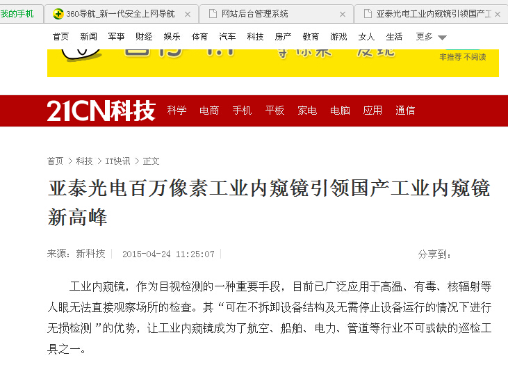 21CN科技:亚泰光电百万像素工业内窥镜引领国产工业内窥镜新高峰