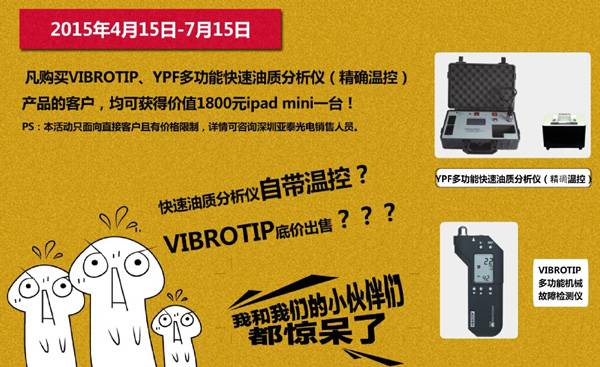 为庆祝亚泰光电自主研发的带“精确温控”功能快速油质分析仪成功问世, 自2015年4月15日起,特进行为期三个月的“以旧换新、免费试用”活动。