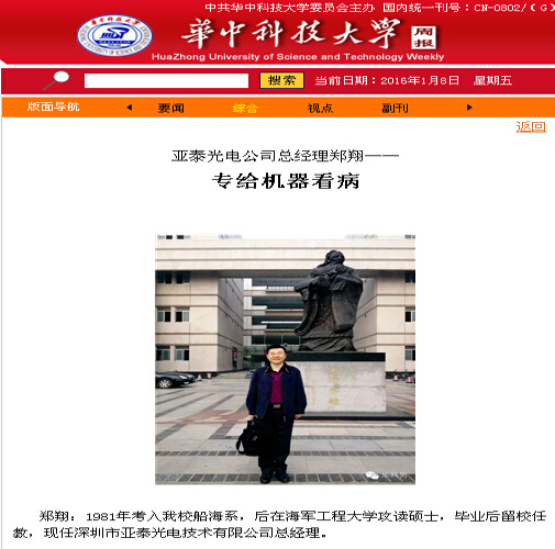 郑翔:1981年考入华中科技大船海系,后在海军工程大学攻读硕士,毕业后留校任教,现任深圳市亚泰光电技术有限公司总经理。