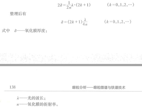 该式表明,当磨粒表面氧化膜的厚度恰恰等于某一单色光1/4波长的奇数倍时,其表面就呈现出该单色光的互补色,例如,当氧化膜的厚度是蓝/紫色1/4波长即约0.038um时,磨粒表面呈草黄色,当氧化膜增厚是波长较长的红/橙色光1/4波长即约0.055um时,磨粒表面呈黄色,不同材质金属表面氧化膜生长速度是不一样的,因此可以根据加热后同一温度下金属材料的颜色(回火色)来判断材料的合金属类,这就是铁谱片加热分析法的原理。