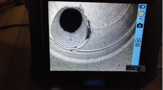 上图中为亚泰光电SIE超清系列视频内窥镜在金丰汽配厂检查排气管的实拍图,很明显的可以看出该排气管壁存在微小的焊接漏洞.