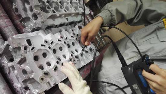 上图为亚泰光电SIE超清系列视频内窥镜在雷诺汽车铸造车间检查气缸缸盖做内部探伤,以判断是否合格.