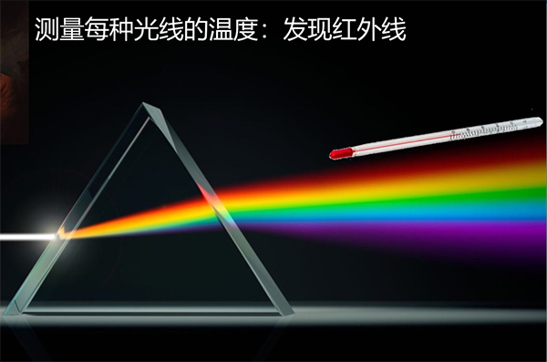 1800年英国科学家Willian Herschel(1738-1822)发现红外线和红外能,迄今220周年。 他用三棱镜将太阳光分开,在各种不同颜色的色带上放置了温度计, 试图测量各种颜色的光的加热效应。 结果发现, 位于红外侧的那支温度计温度上升最快。 为此, 他得出结论, 太阳光谱中, 红光的外侧必定存在看不见的光线, 这就是红外线, 其波长范围在0.75-1000um.