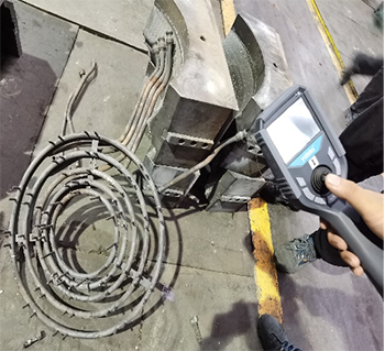 客户现场主要看轮毂磨具内部通道的堵塞、脱落、毛刺情况,管通道孔径13mm, 呈环状分布,进口5cm的位置,有双向的分支通管,亚泰光电MIE高清系列内窥镜的探头进入导管后,需要分别从两端进入,本次演示时,没有2.8mm360°转向的演示设备,需要手动旋转管线,预判转向方位,清晰度方面客户对MIE内窥镜非常认可。导管内部多处焊接的位置,实测时能明显看见内部的焊接堵塞,还有部分脱落,放置货架的模具,内部有大量灰尘、虫子等多余物。客户方现场相关负责人表示他们前面找了很久类似的内窥镜产品,对亚泰光电2.2mm内窥镜产品效果很认可,当即表示了进一步合作的意向。