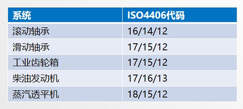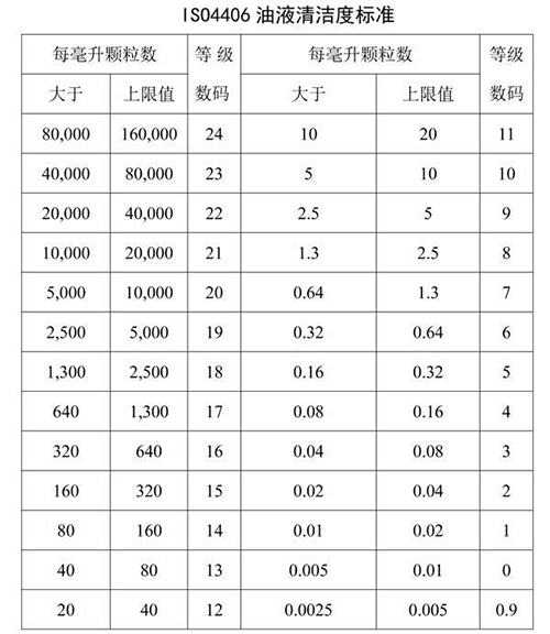 油液污染度常用国际ISO4406-1999污染度等级标准表示,它是以1ml润滑油中颗粒数来表示,采用三个数码代表污染度等级,前一数码代表1ml油样中尺寸大于4 μm的颗粒数等级,中间的数码代表1ml油样中尺寸大于6 μm的颗粒数等级,最后的数码代表1ml油样中尺寸大于14 μm的颗粒数等级。