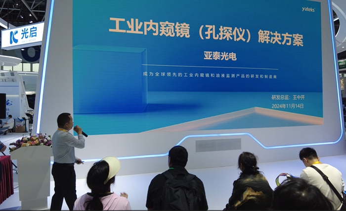 11月14日,亚泰光电继续在航展现场举办了先进检测技术交流会。此次交流会聚焦于工业内窥镜(孔探仪)解决方案及在线油液监测传感器技术。公司研发总监王中开先生再次登台,详细介绍了亚泰光电在工业内窥镜领域的最新研究成果和解决方案。这些方案以双百万高清晰度、极细管径、极近焦镜头等特点,能够满足航空航天等不同行业客户的多样化需求。