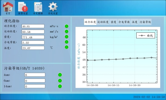 本软件为“在线油液质量监测系统”,用于实时监测油液的各种油品状态指标,如动力粘度、运动粘度、密度、介电常数、温度、污染度,以曲线图规律性展示,并记录保存,给用户对油液的状态提供参考。