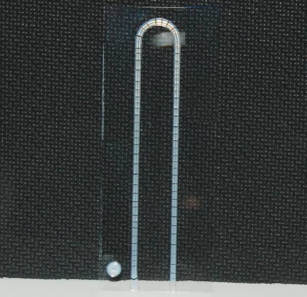 铁谱片,分析式铁谱仪耗材,用于油品定性分析——铁谱分析制谱用。油样经虹吸泵引导流入铁谱片,在高梯度磁场作用下,油品中的铁磁性颗粒会按照规律排布于铁谱片的U型槽内。