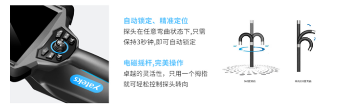 4、自动锁定 精准定位——亚泰光电专利, 步进、快慢速调节和微调锁定功能以及电动360°转向控制,最大单向220°弯曲角度。