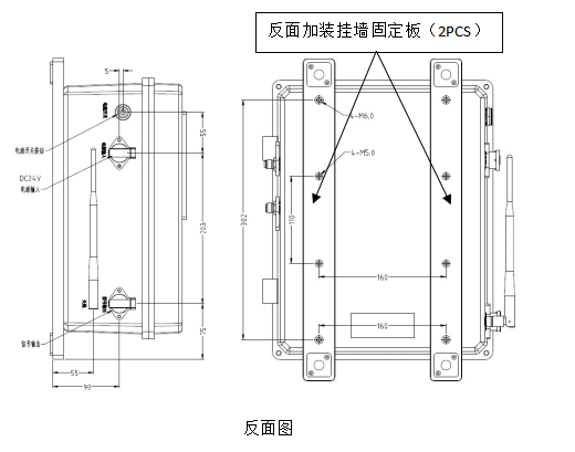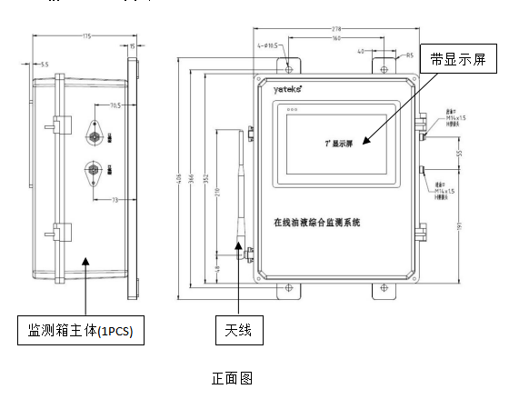 监测箱内部结构组成:磨粒传感器+清洁度传感器+含水率传感器+粘度传感器+微量水传感器+介电常数等,用户可根据不同需求进行功能选配。监测箱外观结构组成:监测箱主体(1PCS)+挂墙固定板(2PCS)+天线。